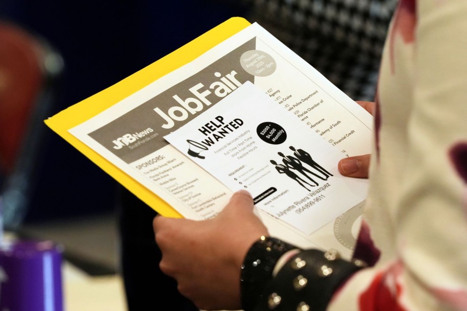 지난 8월 플로리다주에서 열린 취업박람회에서 구직자가 서류를 들고 인터뷰를 위해 대기하고 있다.  AP