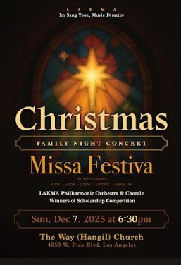 라크마 필하모닉 오케스트라 앤 코랄(단장 최승호, 음악감독 윤임상)이 주최하는크리스마스 패밀리 나잇(Christmas Family Night)’ 음악회가 오는 7일 오후 6 30, LA 한길교회에서 열린다. 올해로 13회를 맞는 이번 연말 공연은 온 가족이 함께 즐길 수 있는 다채로운 구성으로 꾸며져 지역 음악 팬들의 기대를 모으고 있다.
