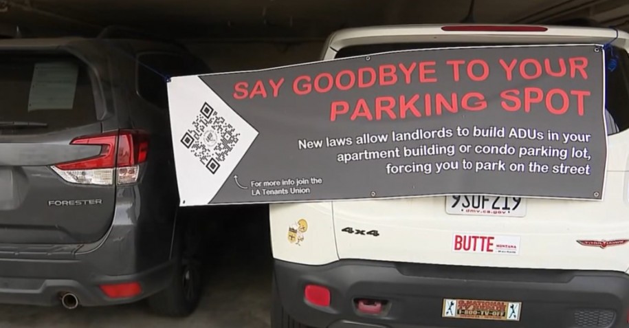 한인타운 5가와 킹슬리 인근 아파트 주차장에 "주차장과 '굿바이' 하라"는 내용의 배너가 걸려 있다. /ABC7 News