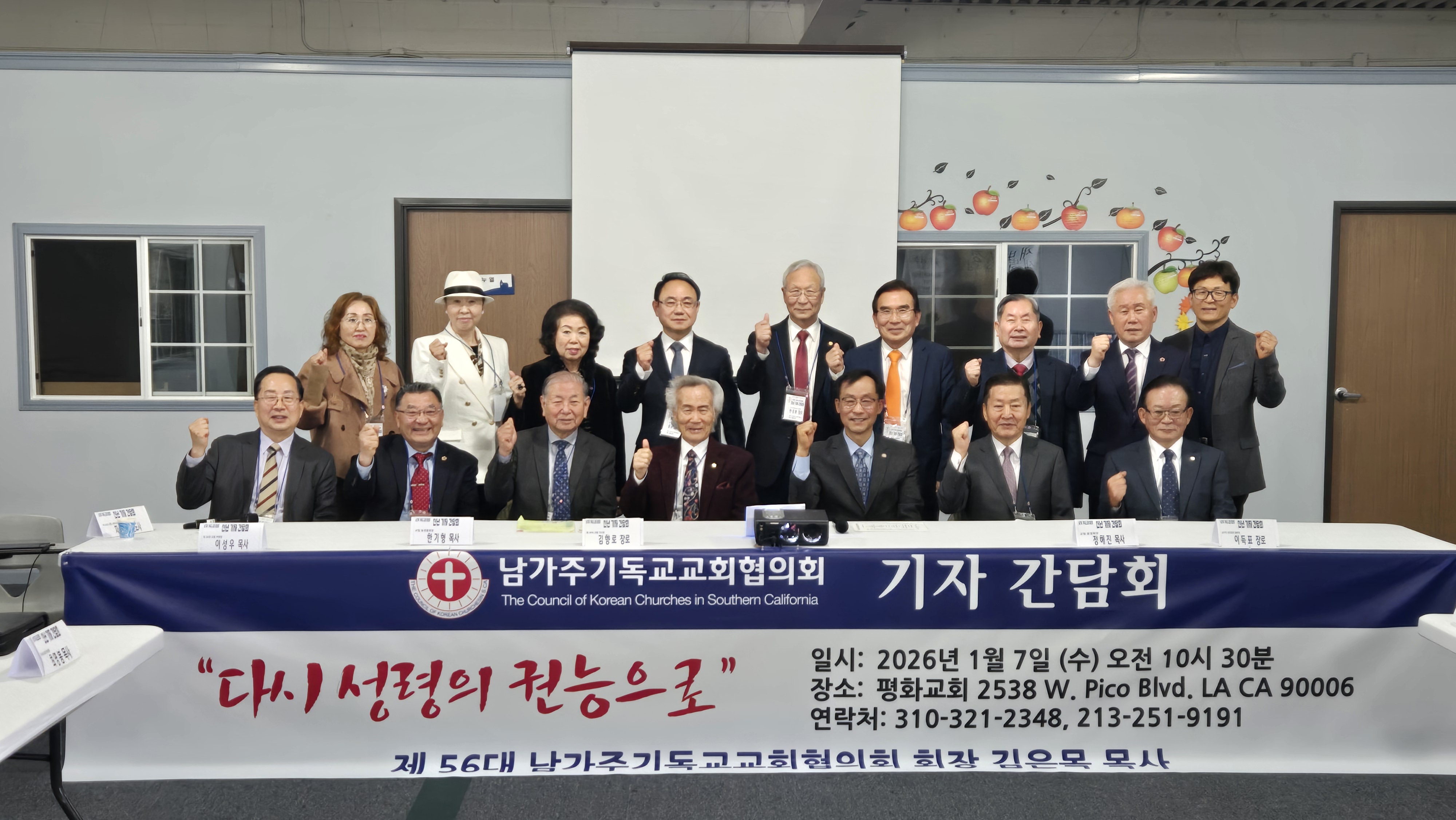 제56대 김은목 회장이 새롭게 중심이 된 남가주교협이 7일 평화교회에서 신년 간담회를 갖고 사업계획을 소개하는 시간을 가졌다. 김은목(앞줄 오른쪽에서 세 번째) 목사, 김향로(앞줄 가운데) 이사장 등 간담회 참석자들이 새해 파이팅을 다짐하며 포즈를 취했다. 김문호 기자