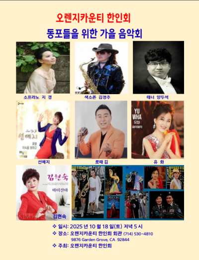 오렌지카운티(OC) 한인회(회장 조봉남)가 오는 10월 18일 오후 5시 오렌지카운티 한인회관(9876 Garden Grove Blvd, Garden Grove.)에서 동포들을 위한 무료 가을음악회를 개최한다.