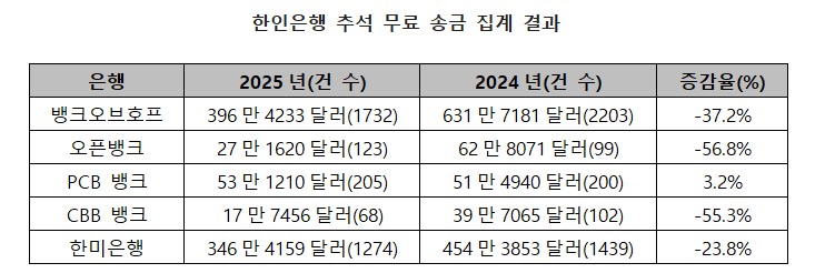 올해 추석을 맞아 남가주 주요 한인은행들이 실시한 무료 송금 서비스 실적이 전반적으로 감소한 것으로 나타났다. 일부 은행은 송금 건수가 증가했음에도 불구하고 총 송금액이 전년 대비 50% 이상 급감하는 등 대조적인 양상을 보였다.