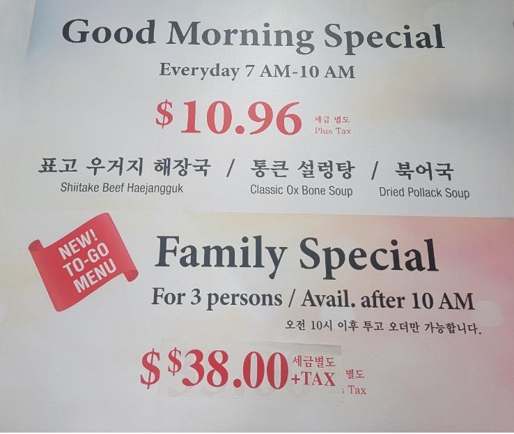 화요일에는화요ONLY 투고스페셜’, 목요일에는목요일 ONLY(1+1) 투고스페셜프로모션을 진행하고 있다. 화요일의 경우 투고에 한하여 곱빼기설렁탕의 경우 18.50달러(+tax), 곱빼기해장국 18.50달러(+tax), 곱빼기 도가니를 26.50달러(+tax)에 먹을 수 있다. ‘목요일 ONLY (1+1)투고스페셜은 갈비탕이나 도가니탕 투고 시 표고우거지해장국을 무료로 주며 가격은 22.15달러(+tax)이다.