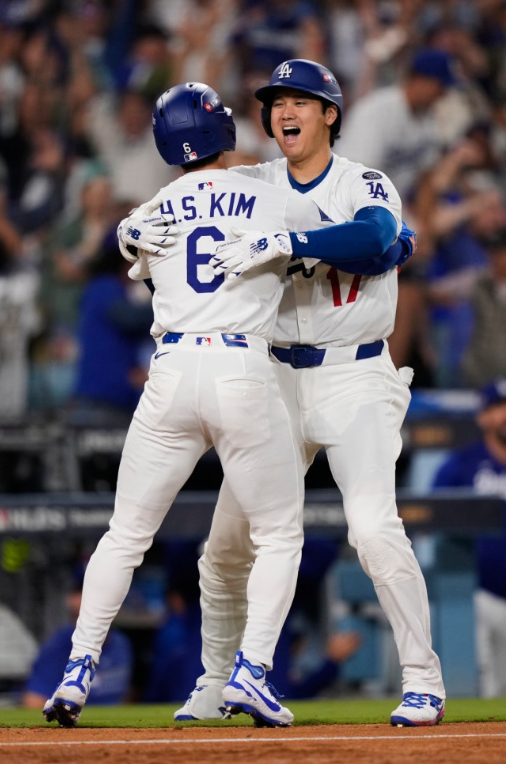 LA 다저스 김혜성이 10일(한국시각) 다저스타디움에서 열린 필라델피아 필리스와의 디비전시리즈 4차전서 연장 11회말 1루 대주자로 기용돼 맥스 먼시의 중전안타로 3루까지 진루한 뒤 앤디 파헤스의 땅볼을 잡은 상대 투수 오라이온 커커링의 실책으로 끝내기 득점을 올리고 오타니 쇼헤이와 얼싸안고 기뻐하고 있다. AP연합뉴스