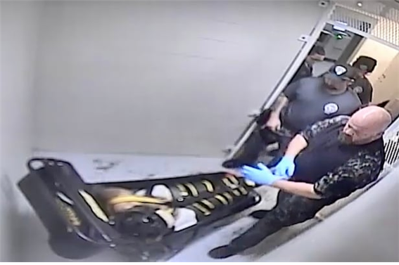 제퍼슨시티 교정센터에서 교도관들이 한 수감자에게 랩을 사용한 모습. 부검 결과에 따르면, 이 수감자는 랩으로 인해 질식사했다. /AP