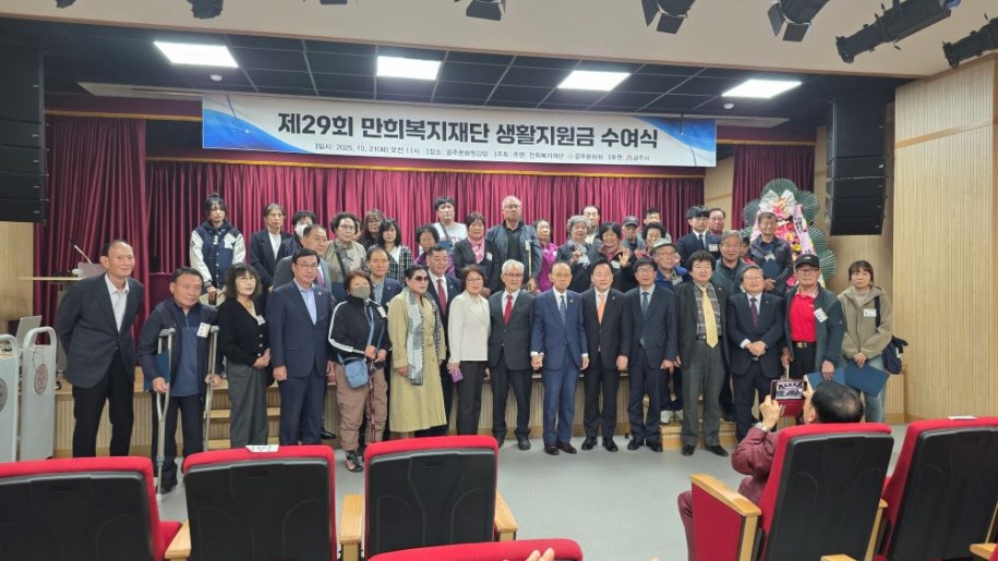 만희복지재단(이사장 박형만)이 주최하는 '제29회 생활지원금 수여식'이 21일(한국시간) 한국 충남 공주문화원 강당에서 열렸다. 재단 측은 이날 공주시가 추천한 독거노인, 소년소녀가장, 장애인 등 50명에게 100만원씩의 생활지원금을 전달했다. 또 정명학교(장애인학교)와 소망의집(지체장애인 공동체)에도 500만원씩을 전달, 이 날 총 6000만원의 기금을 전달했다. 이로써 재단은 올해 행사까지 29회 동안 총 6억2655만원을 공주시 불우이웃을 위한 생활지원금 및 장학금으로 지원했다. 박형만(앞줄 가운데) 이사장과 이진삼(앞줄 오른쪽에서 7번째) 세계충정향우회총재, 최원철(박형만 이사장 왼쪽 여성 뒤) 공주시장, 임경호 공주대 총장 등 행사 참석자들이 기념촬영을 했다. /만희복지재단