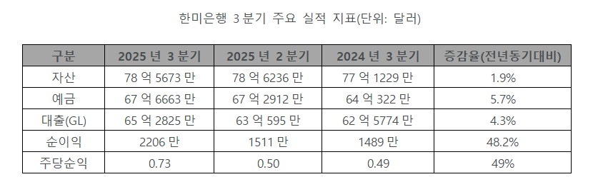 한미은행(행장 바니 이)의 지주사인 한미파이낸셜 코퍼레이션이 2025년 3분기 2206만달러(주당 0.73달러)의 순익을 기록했다고 21일 밝혔다.