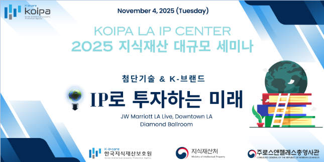 LA총영사관(총영사 김영완)은 한국지식재산보호원 LA IP센터와 함께 오는 11월 4일 오후 12시 LA 다운타운 JW Marriott Hotel LA Live 플래티늄 볼룸에서 ‘2025년 지식재산 세미나’를 개최한다.