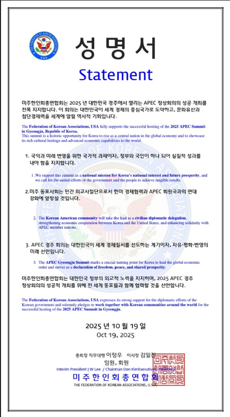 미주한인회총연합회(회장 서정일)는 2025 APEC(아시아·태평양 경제협력체) 경주 정상회의의 성공적인 개최를 전폭적으로 지지한다는 성명서를 발표했다.