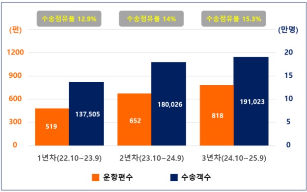 연도별 실적을 살펴보면, 1년차(2022.10~2023.9) 13만7505명(519편), 2년차(2023.10~2024.9) 18만26명(652편), 3년차(2024.10~2025.9) 19만1023명(818편)으로 운항 편수와 여객 수가 매년 꾸준히 증가했다.