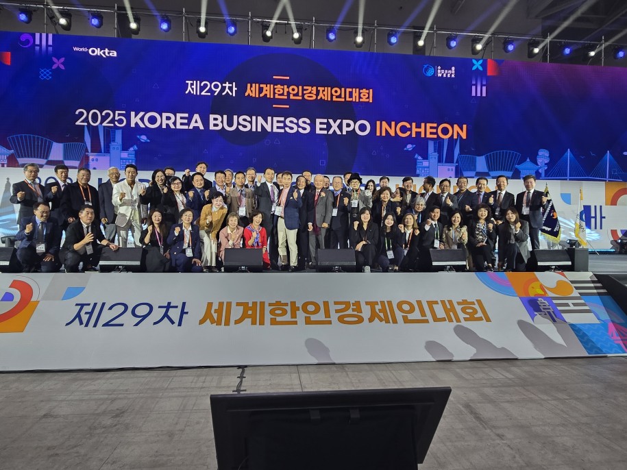 ‘제29차 세계한인경제인대회(2025 코리아 비즈니스 엑스포 인천)'가 지난 27일 인천 송도컨벤시아에서 개막해 오는 30일까지 나흘간 펼쳐진다. 세계한인경제무역협회(월드옥타) 주최·주관으로 열리는 이번 대회에는 600여 로컬기업과 전 세계 58개국에서 모인 월드옥타 회원 바이어 약 1500명이 참가해 한국 중소기업의 글로벌 진출을 돕는 수출상담회를 활발하게 펼칠 것으로 기대된다. 주최 측은 대회기간 동안 2000여 명이 관람할 것으로 추산하고 있다. 개막식에는 박종범 월드옥타 회장의 개회사, 유정복 인천광역시장 환영사, 김경협 재외동포청장 등의 축사가 이어지는 등 정·재계 주요 인사들이 대거 참석했다. 옥타LA에서도 정병모 회장을 비롯한 이사, 차세대 회원 등 90여 명이 참가했다. 옥타 LA 멤버들이 개막식 후 기념촬영을 했다. /옥타 LA