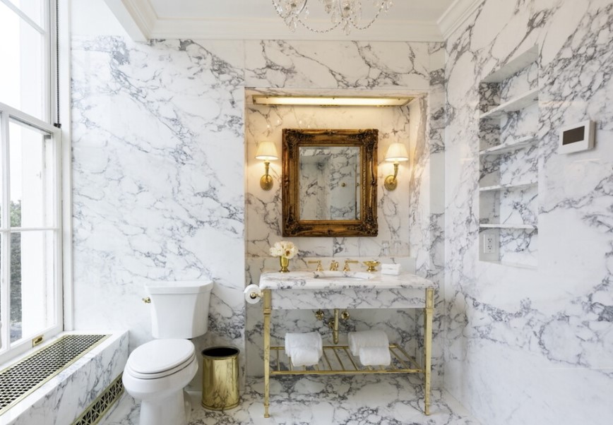 공개된 사진을 보면 변기, 세면대, 샤워실, 욕조 등 시설들이 주로 유광 대리석으로 보이는 재료로 되어 있다. 손잡이, 경첩, 샤워기, 수도꼭지 등은 황금빛 재질로 만들어 액센트를 줬다.