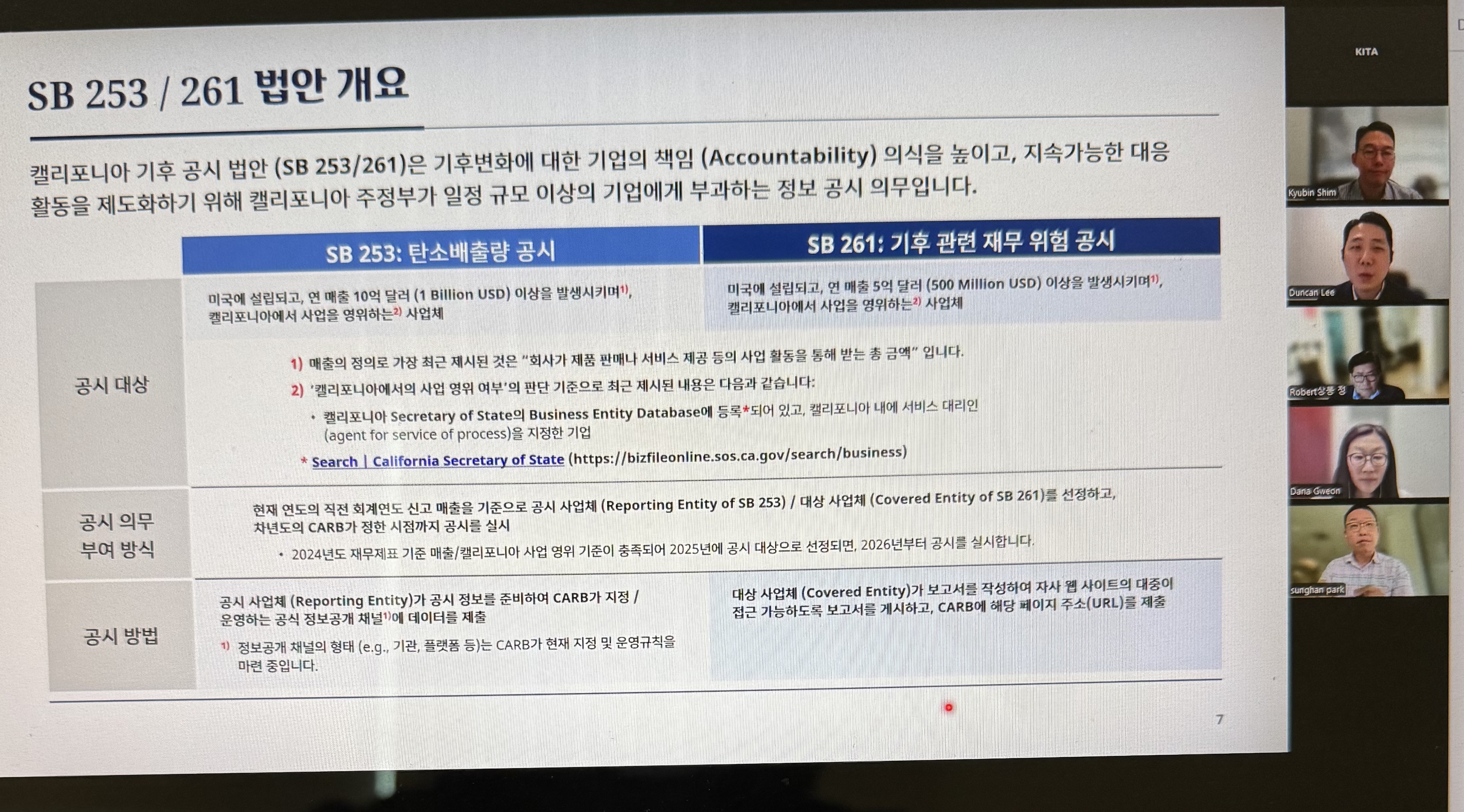 캘리포니아 한국기업협회(KITA· 회장 김한수)가 5일 기후공시법인 'SB 253/261'에 대한 온라인(ZOOM) 설명회를 가졌다. 기후 관련 기업의 책임성과 투명성을 높이기 위한 두 법은 지난 2023년 10월 뉴섬 주지사 서명으로 법률로 제정됐으며 곧 시행을 앞두고 있어, 규모가 있는 일부 KITA 회원사들도 해당할 수 있어 관심을 끈다. 이날 강연은 ESG RISK & COMPLIANCE ADVISORY'의 던컨 리 매니저가 진행했다. 'SB 253'은 연매출 10억달러 이상의 캘리포니아 사업체에 적용되며, SB 261은 연 매출 5억달러 이상의 캘리포니아 사업체를 대상으로 각각 '탄소배출량 공시'와 기후 관련 재무 위험 공시를 규정하고 있다. SB 261은 2026년 1월 1일부터 공시하게 된다. 줌 참석자들이 온라인 강연을 경청하고 있다. /KITA