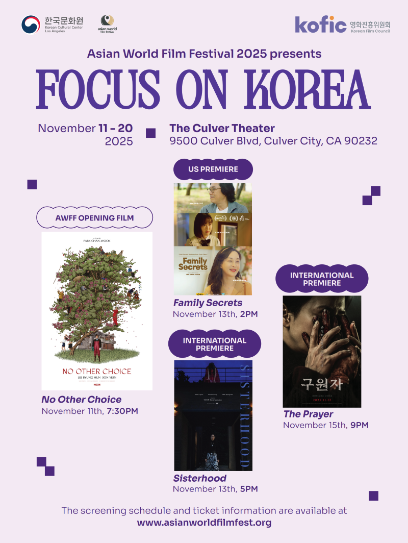 AWFF의 영화 상영은 컬버 극장(The Culver Theater)에서 진행되며, 11일 오후 7시 30분 박찬욱 감독의 신작 ‘어쩔수가 없다(2025·이병헌, 손예진, 박희순, 이성민, 염혜란 등 출연)’가 개막작으로 상영되며 화려한 막을 올린다.