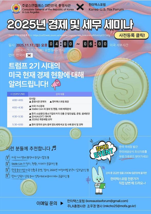 LA총영사관(총영사 김영완)은 한미택스포럼과 함께 오는 17일 오후 4시 온라인(Zoom)을 통해 ‘2025 경제 및 세무 세미나’를 개최한다.