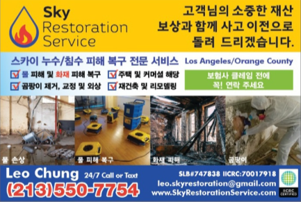 부에나파크를 비롯한 남가주 전역에서 침수·누수·화재 등 각종 재산 피해 복구 서비스를 전문으로 하는 ‘스카이 레스토레이션 서비스(SKY Restoration Service‧대표 레오 정)’가 신속하고 체계적인 복구 솔루션으로 지역사회에서 신뢰를 얻고 있다.