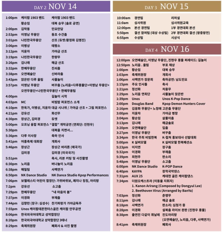 행사 마지막인 16일에는 국악과 민요, K-팝 행사가 이어지는 가운데 오후 3시30분부터 한복 홍보대사 선발 및 K실버모델 한복패션쇼가 연이어 진행된다.  한국 문화유산의 깊이를 되새기고 세대와 지역을 넘어 문화를 공유하기 위한 자리로 마련된 축제인만큼 전통춤과 소리, 기악, 판소리가 마지막까지 행사장을 환희의 무대로 물들일 것으로 기대된다.