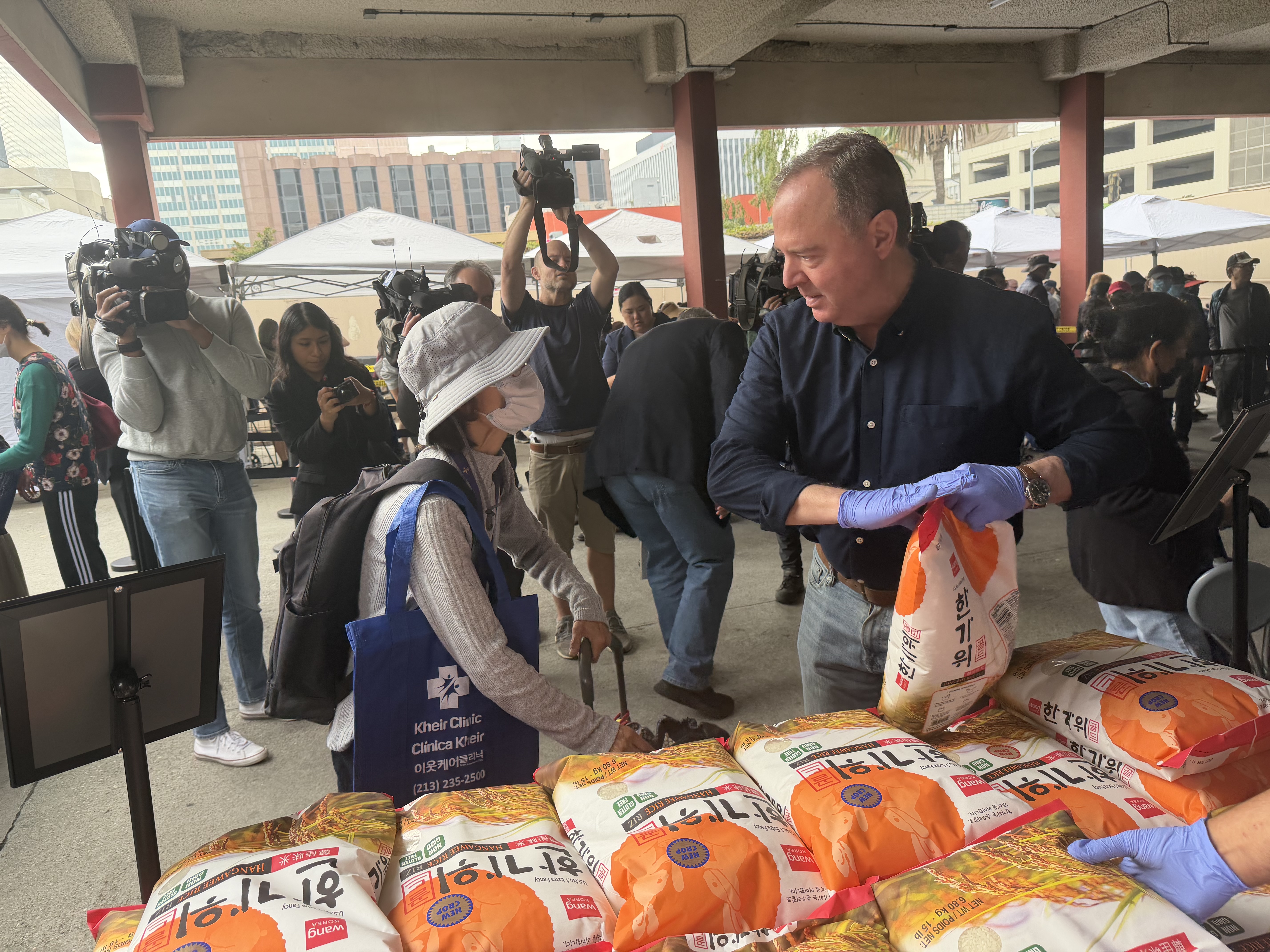 애덤 시프 연방상원의원(오른쪽)이 쌀을 배포하기 전 한인 시니어와 대화를 하고 있다./ 이훈구 기자