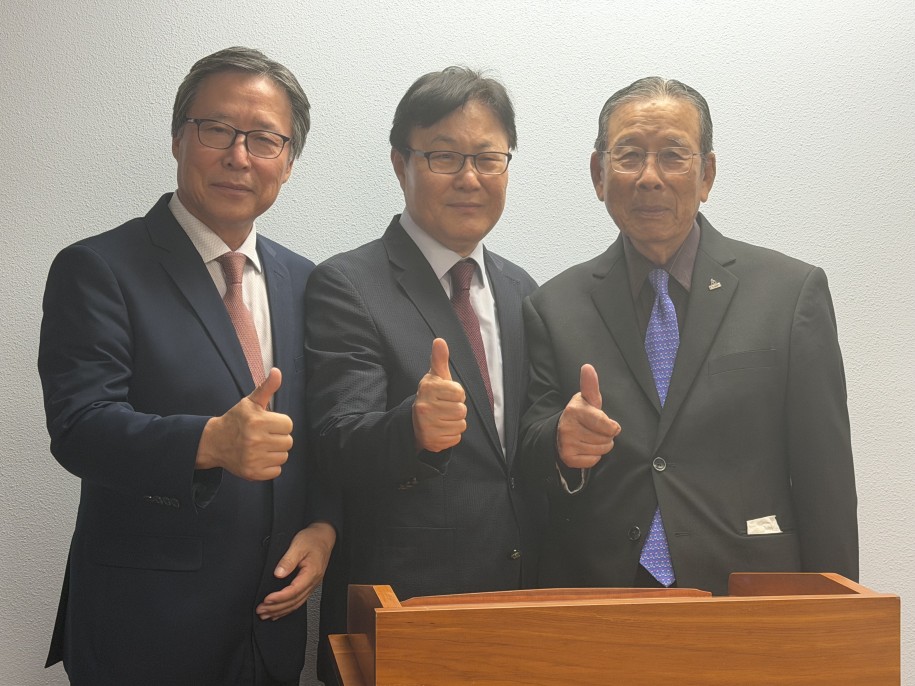 글로벌 소망교회의 세 주역들. (왼쪽부터) 진건호 남가주기독교교회협의회장, 오승훈 담임목사, 남가주기독교교회협의회 모종태 이사장 / 이훈구 기자