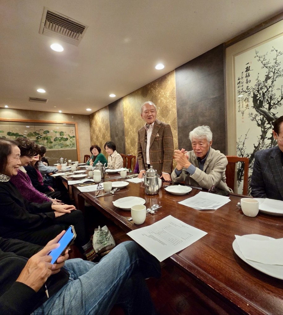 경희대 남가주 총동문회가 지난 14일 용수산에서 2025년 정기이사회를 했다. 이사회를 마치고 경희대 북미주 연합동문회 초대 회장을 지낸 조병태(앞줄 오른쪽에서 세 번째) 회장, 차기 이상명(앞줄 왼쪽에서 두 번째) 회장을 비롯한 회의 참석자들이 기념촬영을 했다. 조병태 회장이 인사말을 하고 있다.(위에서부터) /경희대 남가주 총동문회