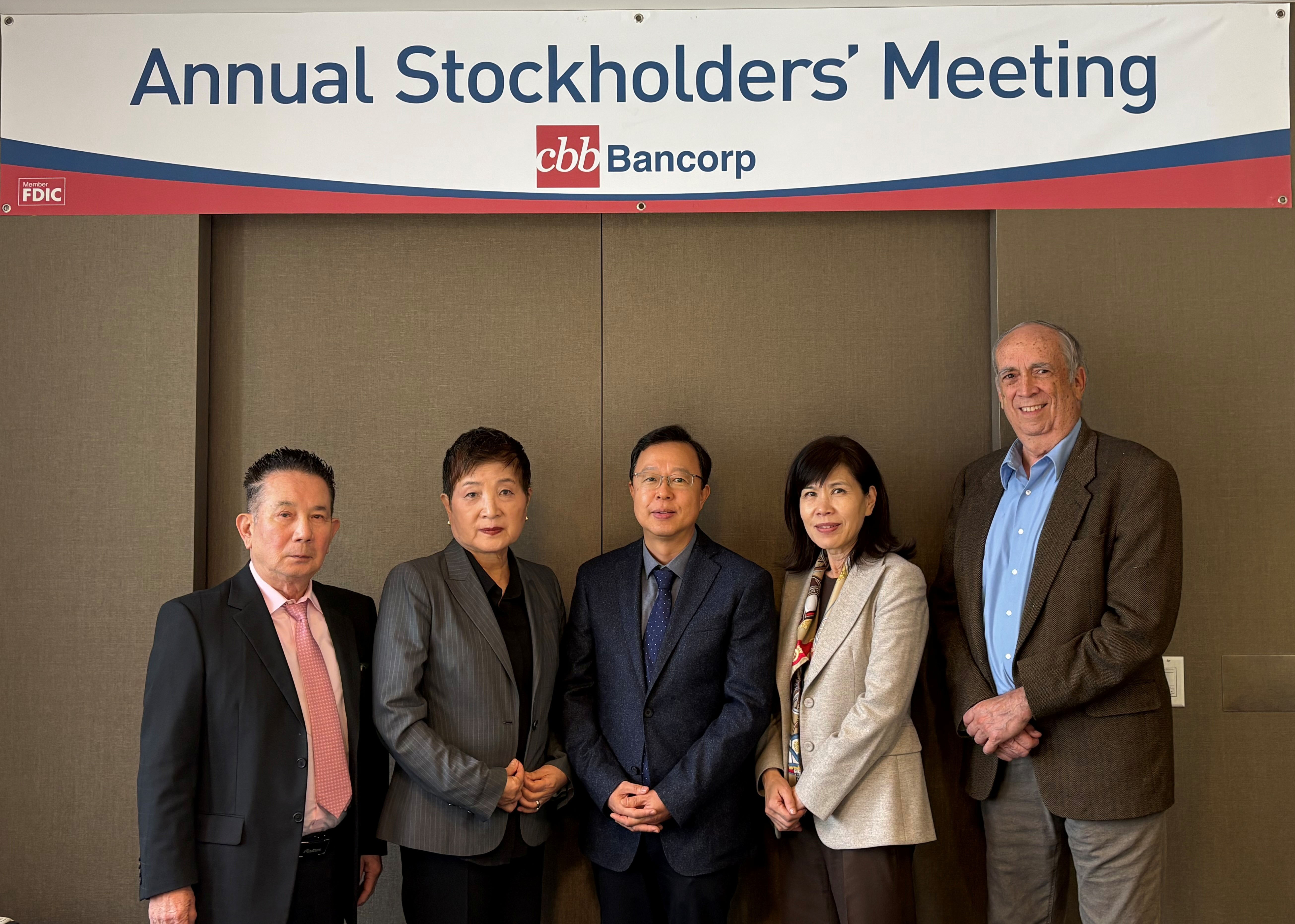CBB은행(행장 리차드 고)의 지주사인 CBB뱅콥이 20일 '2025년 정기 주주총회'를 LA윌셔본사에서 개최했다. 이날 주총에서는 이사진 재선임, 외부 회계감사법인 선정 등의 안건을 통과시켰다. 박순한 이사장을 비롯해 정원숙, 예충열, 더글라스 고다드 이사와 리차드 고 행장의 연임이 확정됐으며, 박승호 전무가 신규 이사로 합류하면서 이사회는 총 6명으로 재편됐다. 주총을 마친 후 예충열 이사, 박순한 이사장, 리차드 고 행장, 정원숙 이사, 더글라스 고다드 이사(왼쪽부터)가 기념촬영을 했다. / CBB 은행
