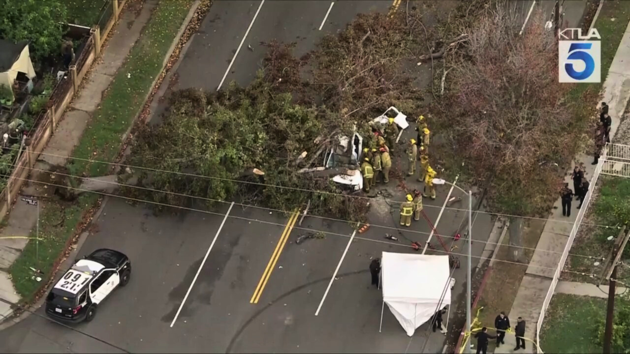 KTLA 뉴스 항공 촬영 영상에는 거대한 나무가 흰색 차량 위로 넘어지며 차선을 가로지른 모습이 담겼다.