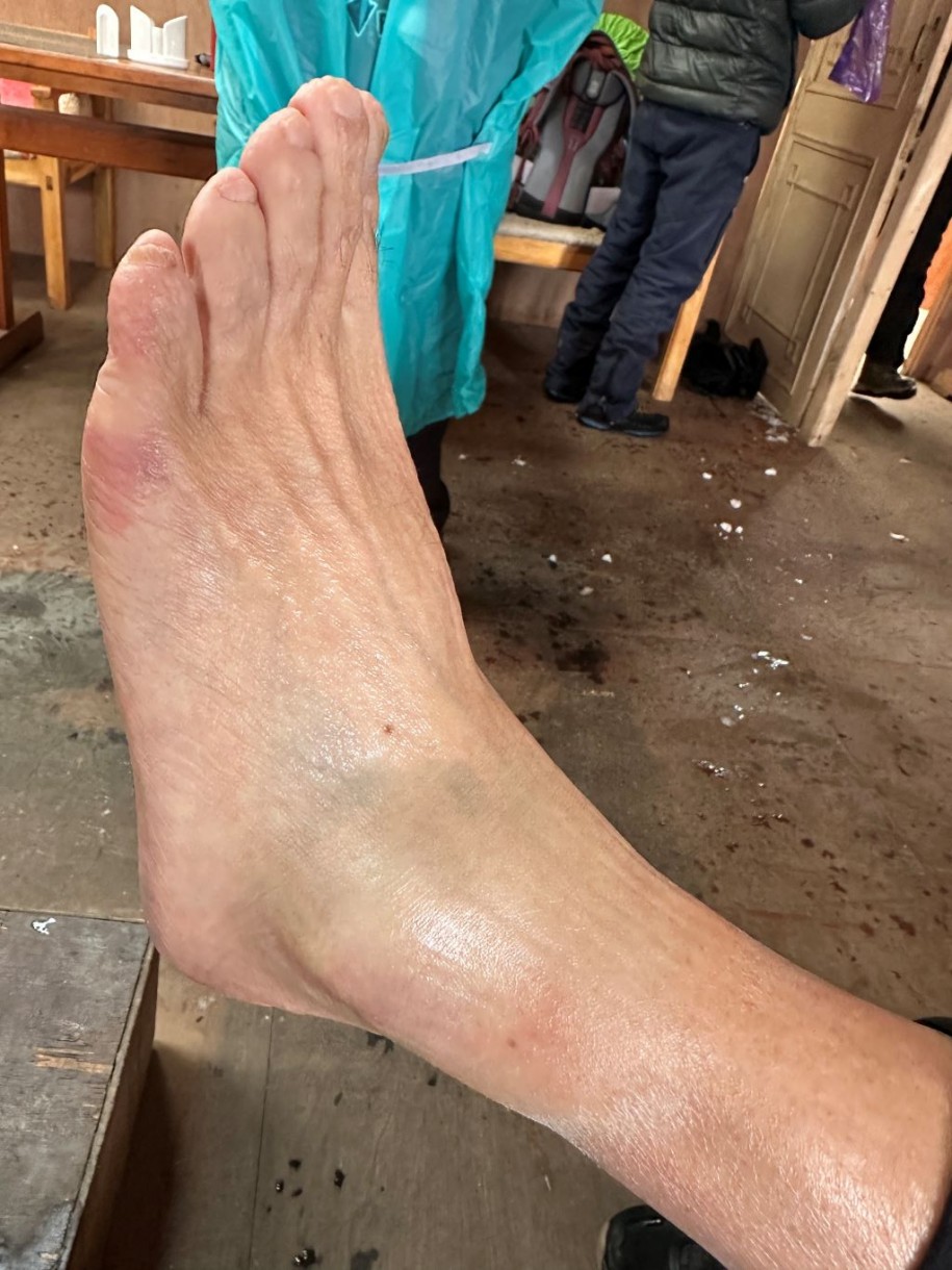 팀원 중 크렘폰 준비를 못 한 사람이 있었다. 한쪽을 나누어 주었다. 날씨는 계속 나빠지고 눈은 계속 오고 있다. 경사진 길이고 눈보라 속이지만 속도를 조금 내기 시작했다. 그때 갑자기 왼쪽 발목이 접질리면서 우두둑하고 큰 소리가 났다. 그리고 나는 길옆 계곡으로 쓰러졌다. 뒤에 오던 동료가 놀라 나를 끌어내 세웠다. 도저히 다리에 힘을 주지 못하겠다. 크렘폰을 한 짝씩 사용하면 더 위험하다는 말이 무엇인지 알 것 같았다. 걸을 수가 없을 정도로 통증이 심하게 몰려왔다. 가이드가 기다리라고 말하고는 로부체 마을로 내려가서 말을 불러왔다. 로부체에서 더 내려간 페리체 마을까지 200달러에 가기로 계약을 끝냈다.