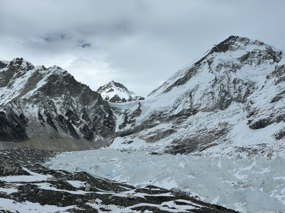 드디어 우리팀 목적지 EBC에 도착했다. 이곳 큰 바위에 EBC라는 표시가 써있다. 말은 하지 않았으나 무엇인가 울컥 치밀어 오른다. 몇 개의 원정대 텐트가 보였다. 빙퇴석 돌무덤에 텐트를 치고 있는 원정대. 등반이 끝나지 않았는지 사람들도 보이고 등짐을 나르는 말도 있었다. 그 앞으로 쿰부빙하와 눈부신 설원이 펼져져 있다. 빙하가 폭포를 이루어 아이스폴이라는 별칭을 얻는 얼음 빌딩 군락들도 보인다. 아쉽게도 에베레스트 정상은 보이지 않는다. 그러나