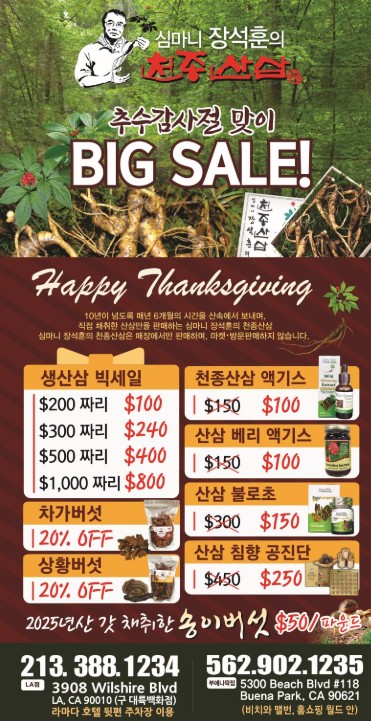 추수감사절 시즌을 맞아 ‘심마니 장석훈의 천종산삼’이 오는 30일까지 전 품목을 대상으로 20~50% 특별 세일을 실시한다. 미국 현지에서 직접 채취한 생산삼을 공급하며 한인들의 건강을 지켜온 업체의 대표 시즌 행사로, 평소 고가여서 구매를 망설였던 소비자들에게는 최적의 기회다. 특히 메디케어 OTC(비처방 일반의약품) 카드 결제도 가능해 시니어 고객들의 반응이 크다.