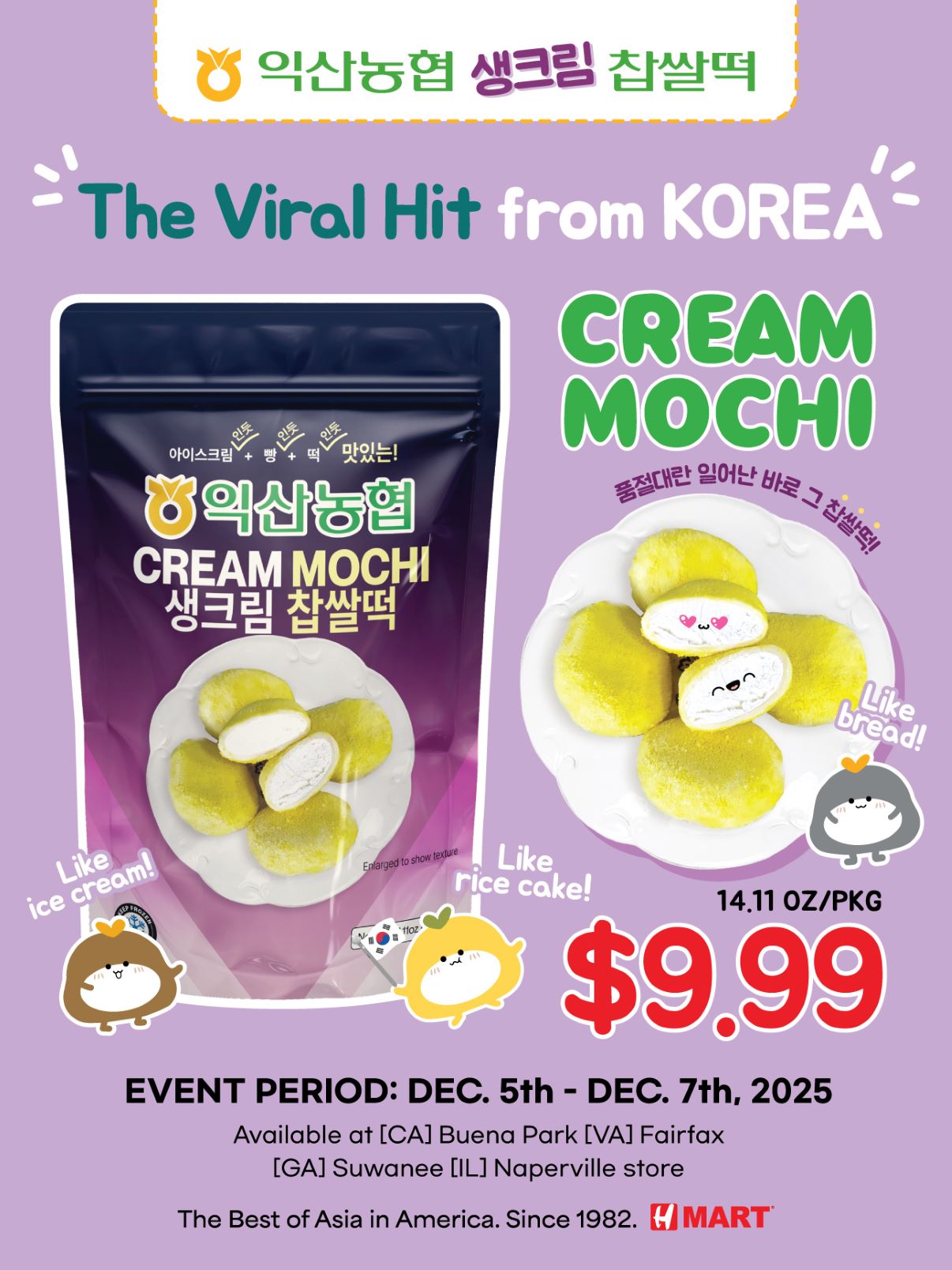 H마트가 ‘익산 농협 생크림 찹쌀떡 팝업 스토어’를 연다. 이번 팝업 스토어는 캘리포니아 부에나파크점에서 오는 5일부터 7일까지 진행될 예정이다. 한국에서 큰 화제를 모은 익산 농협 생크림 찹쌀떡은 한정수량으로 판매된다.