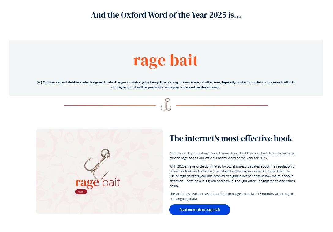 '옥스퍼드 영어사전(OED)’을 편찬·발간하는 옥스퍼드대 출판부(OUP) 산하 '옥스퍼드 랭귀지스' 사업부가 2025년 '올해의 단어'로 '분노 미끼(rage bait)’를 선정했다.