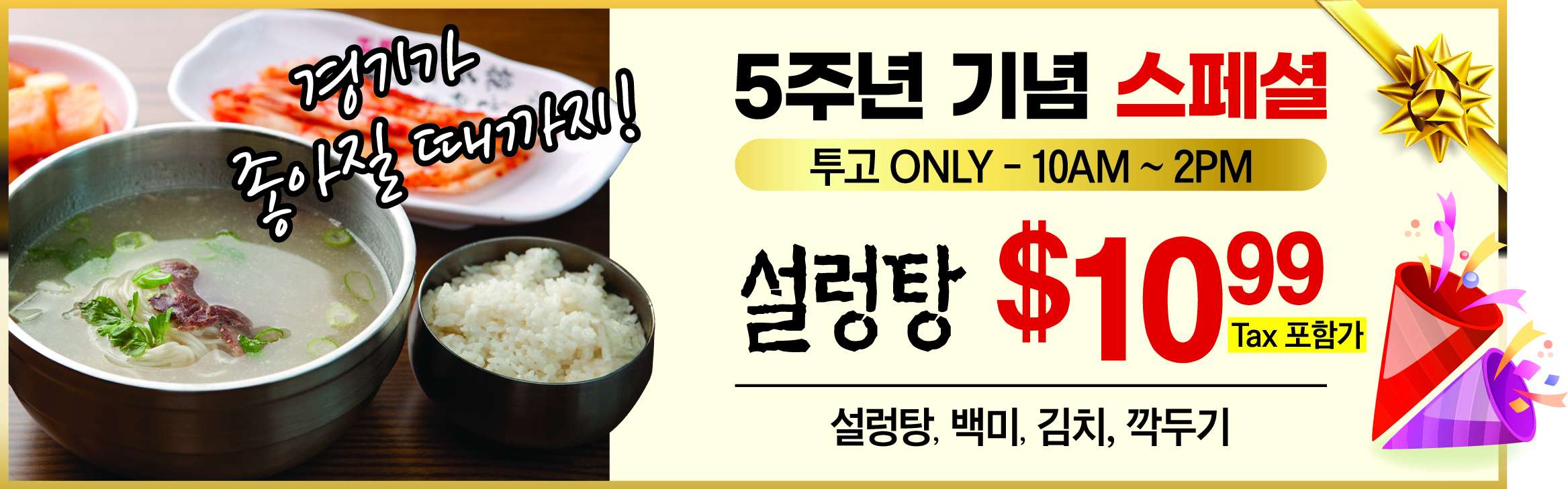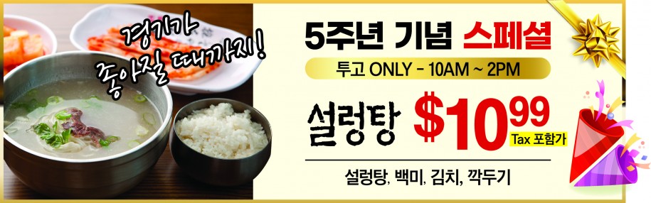 이번 5주년 기념 스페셜의 핵심은 설렁탕이다. ‘경기가 좋아질 때까지’ 오전 10시에서 오후 2시까지 투고 손님에 한하여 설렁탕을 $10.99(TAX포함가)에 제공한다. 기존 ‘화요일 ONLY 투고 스페셜’도 곱빼기 설렁탕 $18.50(TAX포함가), 곱빼기해장국 $18.50(TAX포함가), 곱빼기 도가니 $26.50(TAX포함가)에 제공한다. ‘목요일 ONLY(1+1) 투고 스페셜’’도 계속된다. 갈비탕이나 도가니탕을 투고하면 표고 우거지 해장국을 무료로 하면서 $22.15(TAX포함가)에 제공한다.