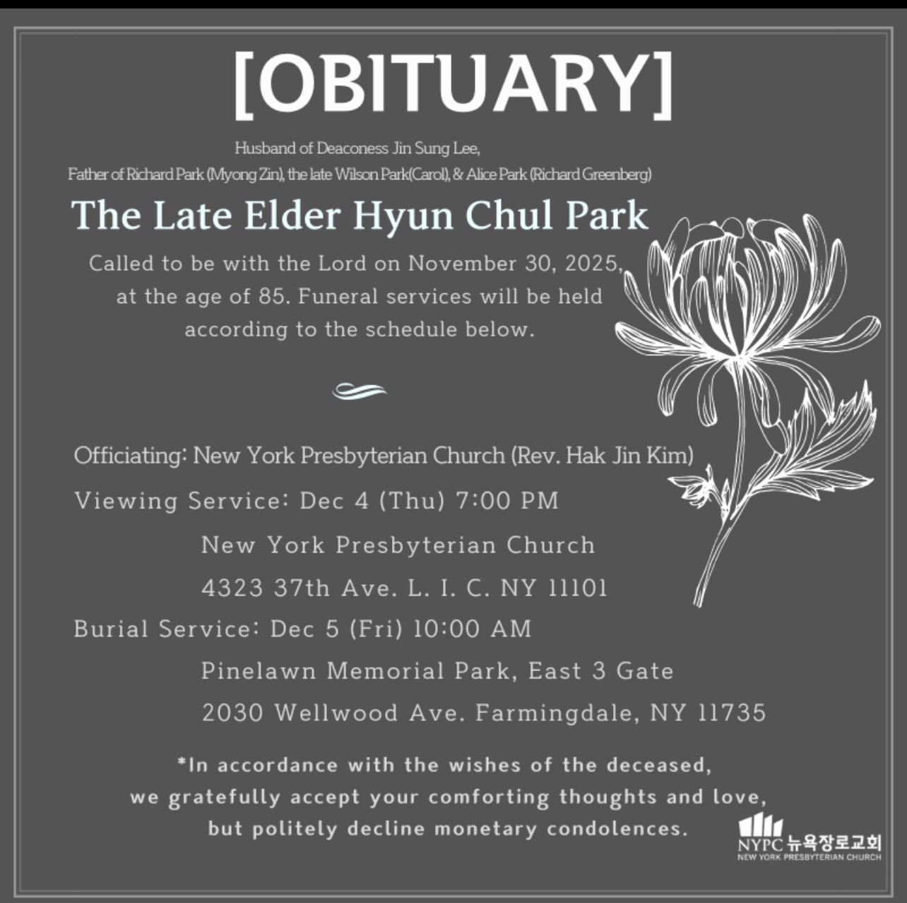 [부음]서울메디칼그룹(SMG) 리처드 박 회장 부친 웹마스터 사회 1시간전 서울메디칼그룹(SMG) 리처드 박 회장의 부친 박현철 장로가 지난달 30일 별세했다. 향년 85세.입관예배는 4일 오후 7시 뉴욕장로교회(4323 37th Ave, L.I.C. NY 11101)에서 김학진 뉴욕장로교회 목사의 집례로 열리며, 하관예배는 5일 오전 10시 파인론 메모리얼파크 이스트 3 게이트(2030 Wellwood Ave, Farmingdale, NY 11735)에서 엄수된다. 유족으로는 부인 이진성 권사, 아들 리처드 박 회장, 딸 앨리스 박씨가 있다.