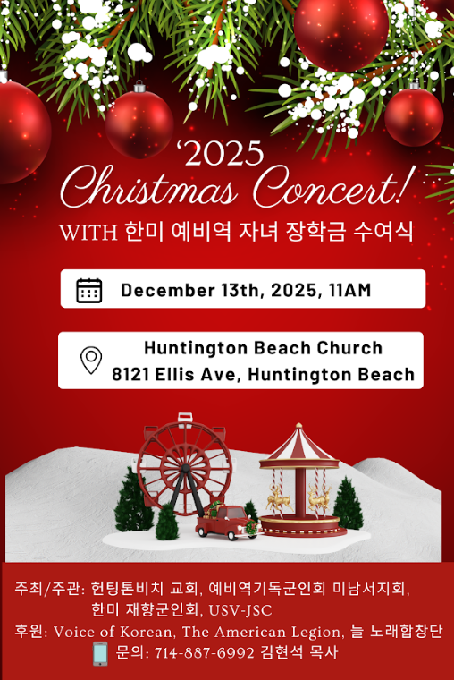 특히 올해는 ‘한미 예비역 자녀 장학금 수여식’이 포함돼 더욱 의미를 더한다. 콘서트는 YouTube ‘Huntington Beach Korean Church(@hbkoreanchurch)’ 채널을 통해 실시간 라이브 스트리밍으로도 시청할 수 있다. 시청을 원하는 이는 유튜브에서 ‘2025 Christmas Concert’로 검색하면 된다. 장학금은 ▲한국전·베트남전 참전용사 후손 ▲한미 예비역 자녀 ▲예비역 지원 활동에 적극 참여해 온 학생들에게 수여될 예정이다. 이번 프로그램은 참전용사들에게 감사의 뜻을 전하고, 미래 세대 리더를 격려하기 위해 기획됐다.