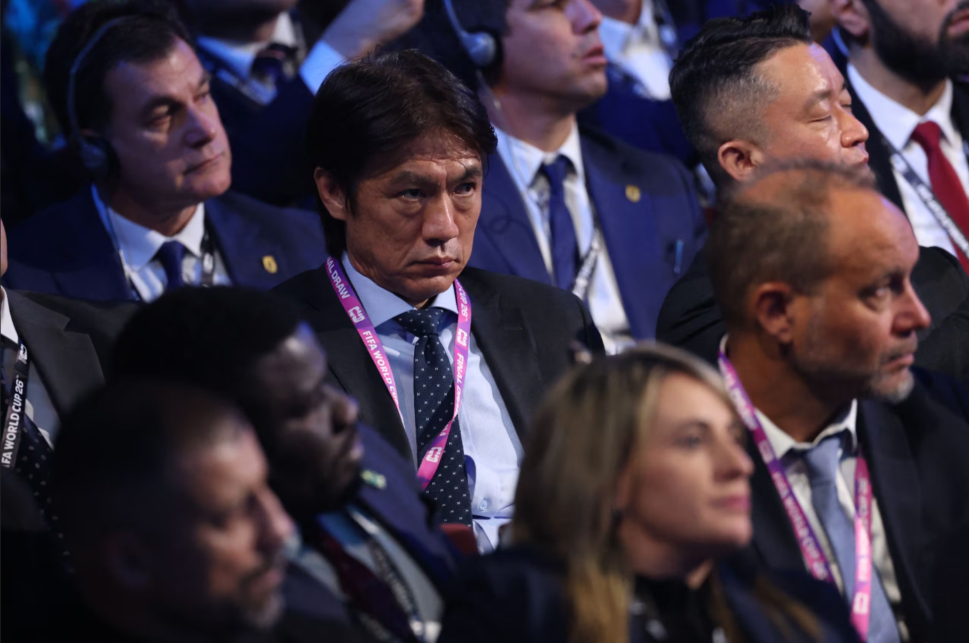 홍명보(가운데) 축구 대표팀 감독이 5일 미국 워싱턴DC에서 열린 2026 FIFA 북중미 월드컵 조 추첨식을 지켜보고 있다. /AFP 연합뉴스