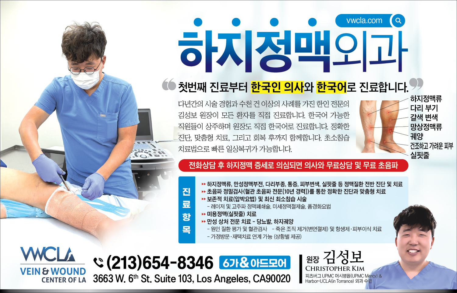 로스앤젤레스 한인타운에 하지정맥 및 상처치료 전문 의료기관인 ‘베인 앤드 운드 센터 오브 LA(Vein & Wound Center of LA)’가 새롭게 문을 열고, 한인 사회를 대상으로 본격적인 전문 진료에 나섰다. 클리닉을 이끄는 김성보 원장(Christopher Kim)은 다양한 임상 현장에서 정맥 및 만성 상처 환자들을 진료하며 전문성을 쌓아온 의료인이다. 김 원장은 “정맥질환은 단순한 미용 문제가 아니라 명백한 의학적 질환이며, 방치할 경우 통증과 부종, 피부 변색, 상처 악화로 이어질 수 있다”고 강조했다.
