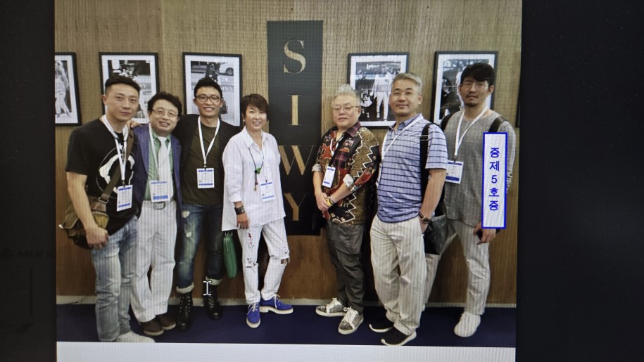 씨위데님의 크리스 박(가운데) 대표 2016년 KMG와 기업 합병을 논의할 때 모습. 박 대표가 지난 11일 강남경찰서에 고소장을 내면서 제출한 증거사진이다. 왼쪽에서 세 번째가 KMG의 김민규 이사, 다섯 번째가 김형석 회장, 여섯 번째가 정철웅 대표이사다.