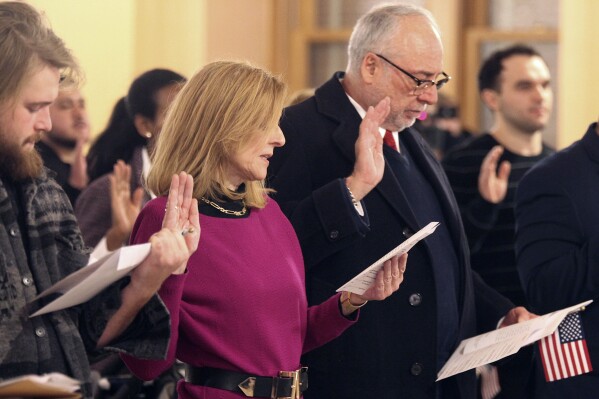 시민권을 취득한 귀화 미국인들이 시민권 선서를 하는 모습. /AP