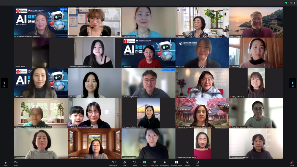 LA한국교육원과 미주초중고한국어교사협의회(KLTA)은 지난 6일과 13일 양일간 ‘2025 전미 한국어 교사 온라인 연수’를 성황리에 개최했다. 이번 연수에는 미국 전역 120여명의 정규학교 한국어 교사와 예비 교사가 참여했다. 이번 연수는 ‘인공지능(AI) 활용을 통한 한국어 수업 교수·학습 전략’을 주제로 진행됐으며, 한국과 미국의 AI 교육 전문가들이 강사로 참여해 챗 GPT, Gemini, Copilot 등 생성형 AI 도구를 한국어 말하기·듣기·읽기·쓰기 수업에 적용하는 실천 중심 프로그램으로 운영됐다. 교사들이 온라인 연수에 참여하고 있다. /LA한국교육원