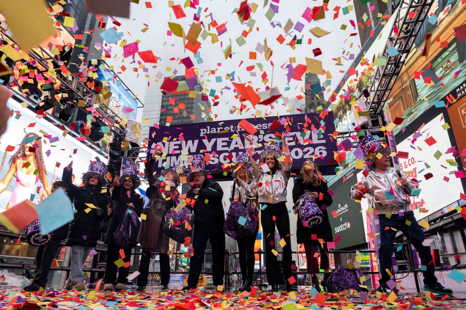 29일 뉴욕 타임스 스퀘어에서 열린 새해맞이 행사 리허설 도중 형형색색의 종이가루가 휘날리고 있다. /AP