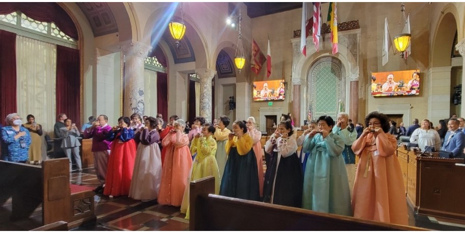 2023년 6월 7일 LA시청 3층 대회의실. 시의회 회의를 앞두고 한복을 곱게 차려입은 18명의 한인 시니어들이 저마다 하모니카를 들고 회의실로 들어섰다. 시의회 초청으로 회의 시작에 앞서 미국국가를 연주하기 위한 방문이었다. 이들은 그동안 갈고 닦은 연주 실력으로 ‘성조기여 영원하라(The Star-Spangled Banner)’를 깔끔하게 소화했다.