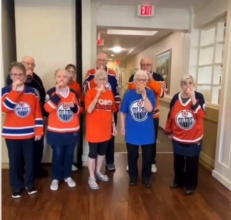 LA킹스와 플레이오프를 치른 캐나다 에드먼튼 오일러스 시니어팬들이 저지를 입고 피리를 불면서 전국적으로 둘풍을 일으킨 한인 시니어 하모니카 앙상블 흉내를 내고 있다.  (위에서부터)