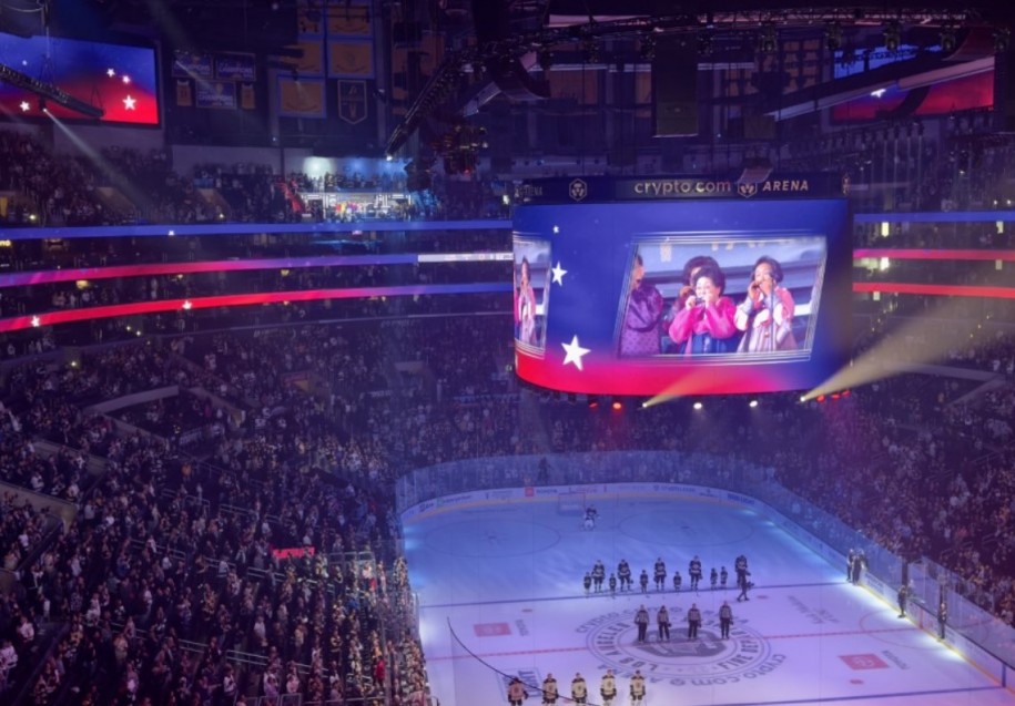 지난 3 23 크립토닷컴아레나에서 열린 LA킹스-뉴욕 레인저스 정규시즌 경기. 식전행사에 시니어센터 하모니카 앙상블이 미국국가를 연주하는 모습이 장내 TV 비춰지고 있다.
