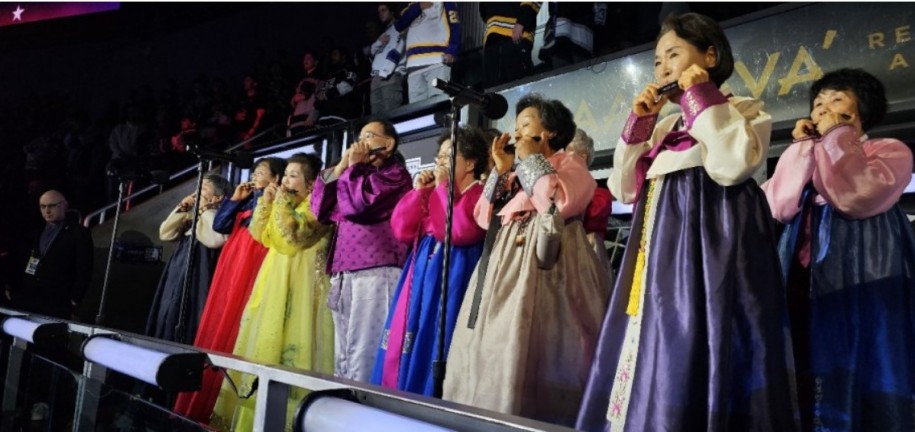 한복을 곱게 차려입은 시니어들이 LA킹스 경기 하모니카 연주를 하고 있다.
