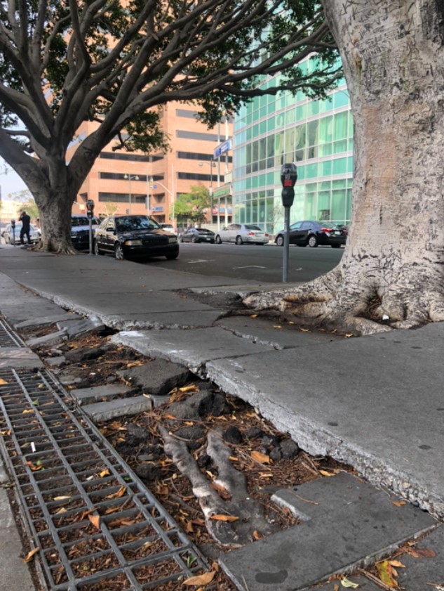 LA한인타운 윌셔가의 인도가 심하게 훼손된 채로 방치돼 있다. /우미정 기자