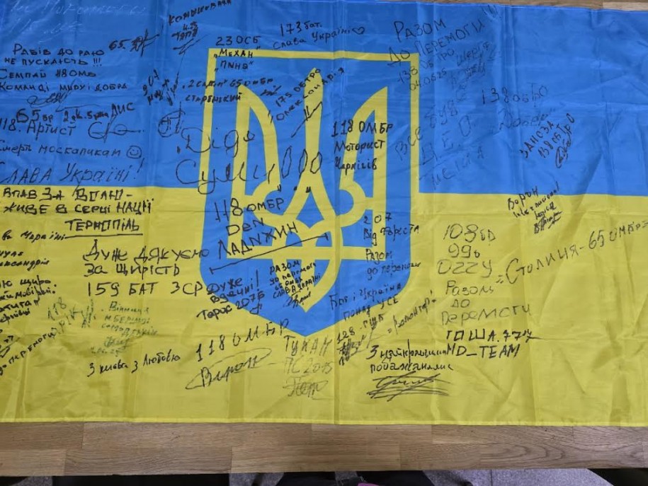 우크라이나 병사들이 직접 적은 감사와 격려의 문구가 담긴 국기. /화랑인터내셔널