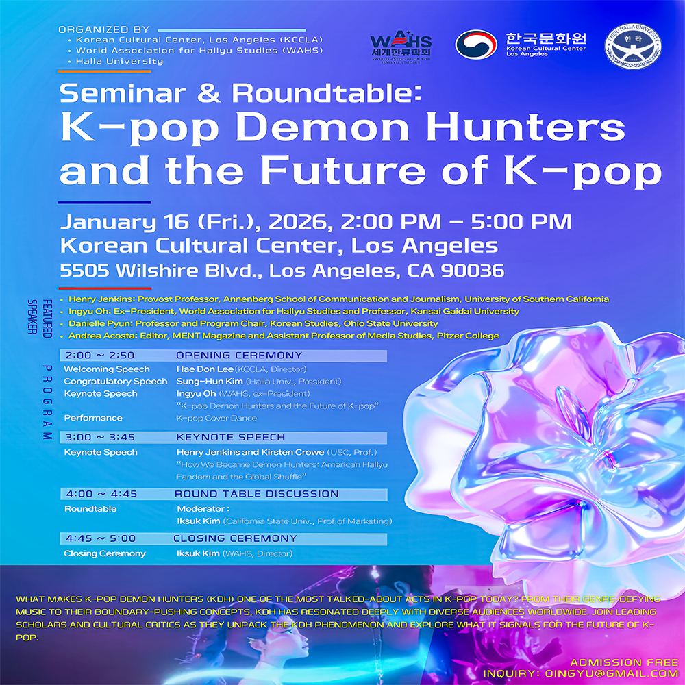 LA한국문화원(원장 이해돈)은 세계한류학회(WAHS)와 함께 오는 16일 오후 2시~5시 문화원 아리홀에서 ‘케이팝 데몬 헌터스와 K팝의 미래 세미나 및 라운드테이블’ 행사를 개최한다.