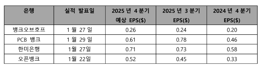 월가 애널리스트들이 내놓은 2025년 4분기 실적 전망에 따르면 한인 상장은행들의 주당순익(EPS)이 전년 동기 대비 개선될 것으로 전망했다.