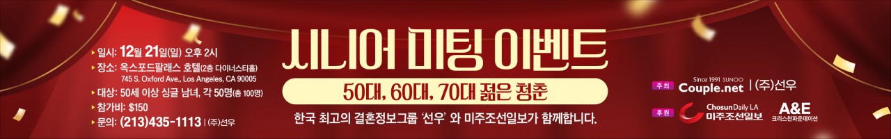 12월21일 오후 2시 옥스포드 호텔'한인사회 최초' 선우 커플닷넷 주관미주조선일보·A&E 기독교재단 후원11월인데도 불구하고 미주 한인사회는 매우 뜨겁다. 정확히는 50세 이상 싱글들의 가슴이 두근거리고 있…